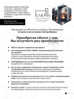 Новый одноэтажный дом 110 м2 с земельным участком 6 соток в пос. Приуральский!Прямая продажа от Застройщика — без комиссий и переплат!Продадим вашу квартиру за 710 дней по МАКСИМАЛЬНОЙ ценеПосчитаем стоимость ремонта и дадим контакты проверенных отделочных бригад.О поселке и локации: Поселок Приуральский самый быстро развивающийся поселок нашего города, с очень развитой инфраструктурой: детская и спортивная площадки, школа и детский сад, остановка маршруток и автобусов в шаговой доступности, магазины, аптеки, детская и взрослая поликлиники все рядом.Об объекте:Общая площадь 110 кв.м.площадь участка от 6 соток, 3 спальных комнаты, кухня-гостиная с выходом на террасу, все коммуникации (газ, свет, вода) заведены в дом, отделка предчистовая.Можно в ипотеку:Цена 7 300 000Ставка 19 % Платёж 35 600 ? Для работников ММК и дочерних структур компенсация по оплате ипотеки 50%.Если вы хотите узнать подробности по лоту или рассмотреть другие варианты недвижимости в данной локации позвоните нам или напишите в сообщения эксперту и получите подборку Лотов.Звоните - показ в удобное время!Арт. 111189856