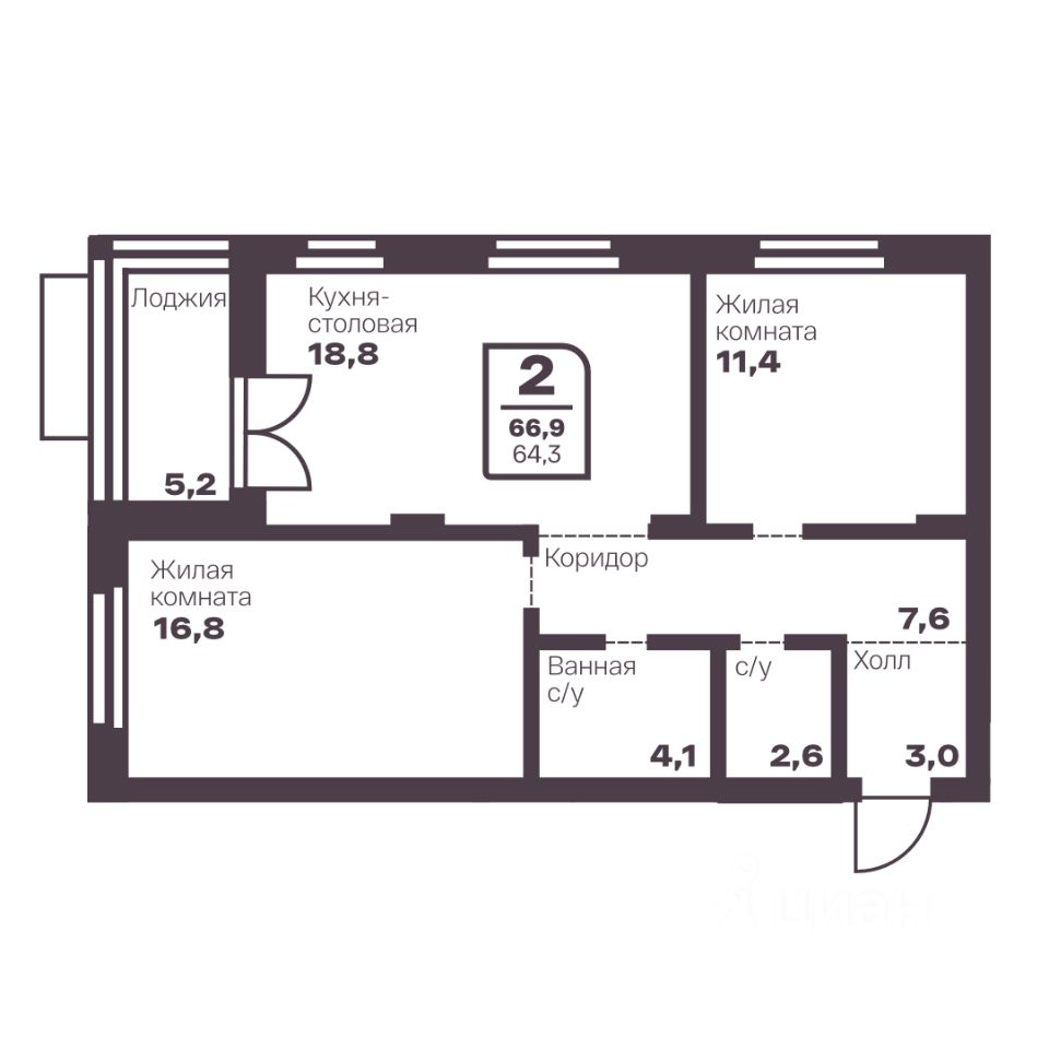 Общая площадь64,3 м2