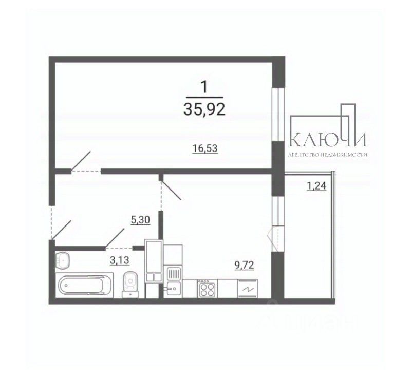 Об объекте: Однокомнатная квартира в черновой отделке общей площадью 35.92 м²