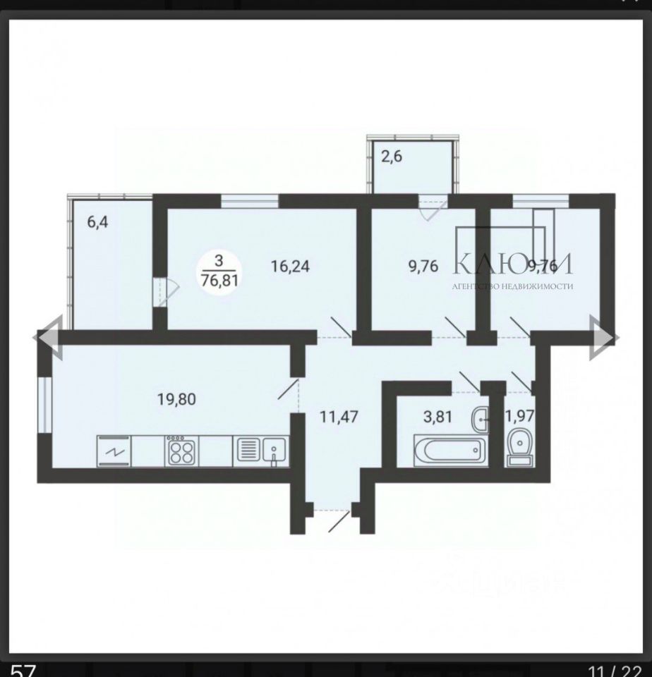• площадь квартиры 76.8 кв. м,