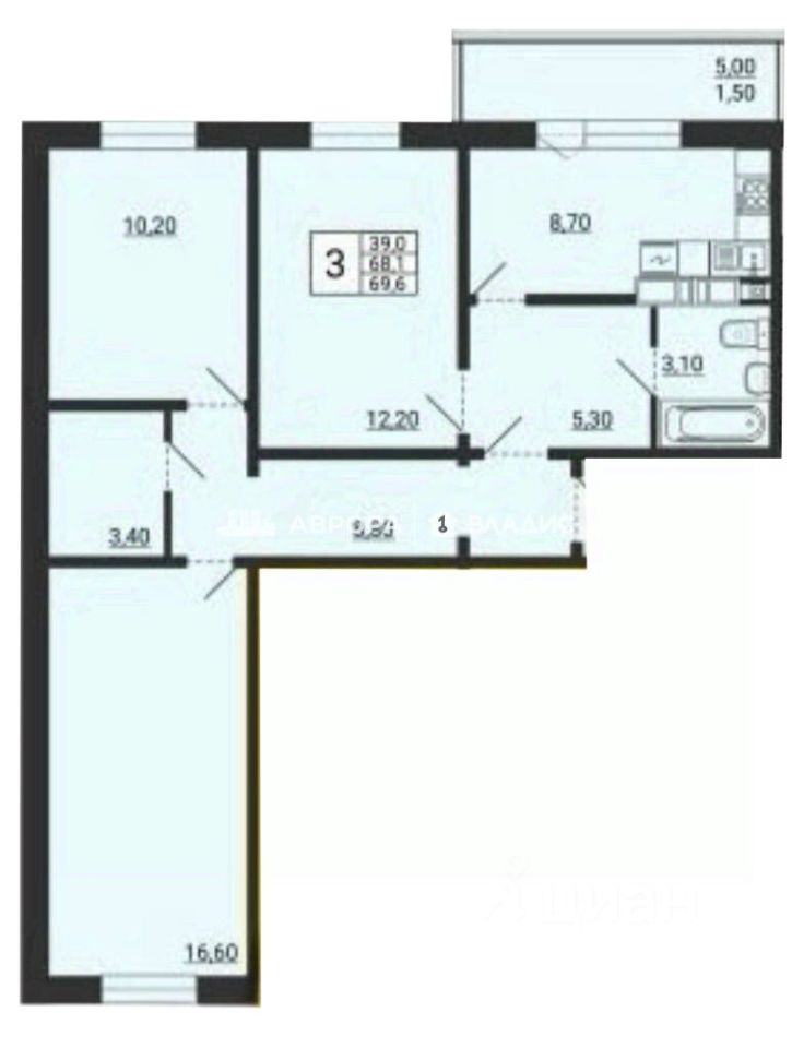 Площадь и планировка: общая площадь квартиры составляет 69,8 кв. м, из которых 39 кв. м — жилая площадь. Три изолированные комнаты (12,2 + 16,6 + 10,2 кв. м) и кухня площадью 8,7 кв. м. Высота потолков — 2,8 м, что создаёт ощущение простора.