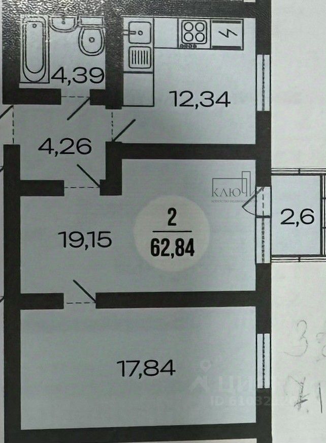 О объекте Планировка квартиры включает в себя: кухня две комнаты санузел балкон Общая площадь 63 кв.м. Квартира и продается в предчистовой отделке: отштукатуренные стены, установлены радиаторы, разведено электричество, качественная входная дверь, двухконтурный газовый котел.
