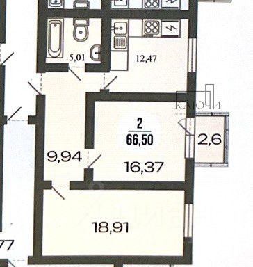 площадь квартиры 66,50 кв.м. просторная кухня 12,47 кв.м. площадь комнат 16,37 кв.м. 18,91 кв.м. балкон 2,6 кв.м.